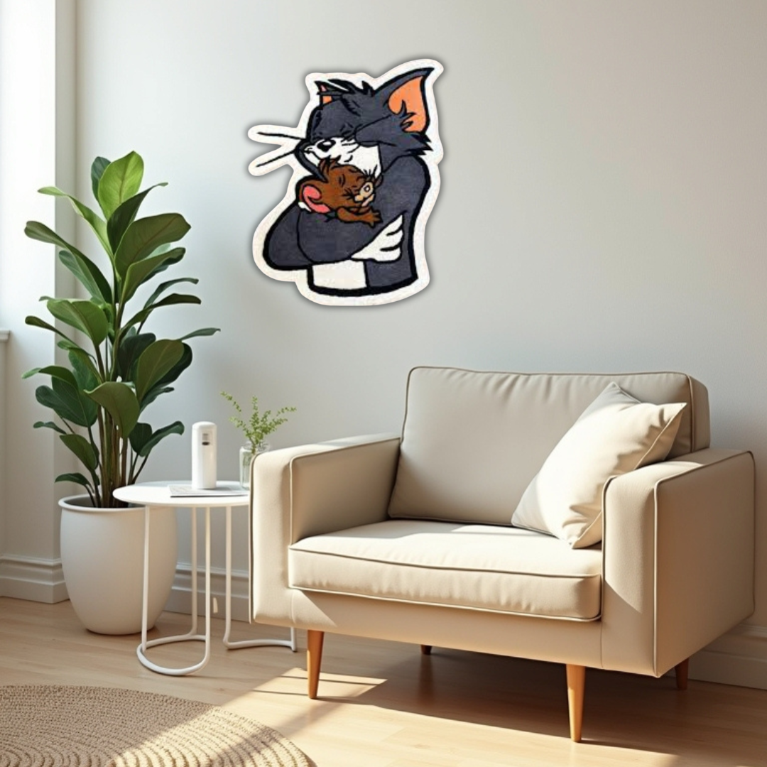 This tufted rug captures a heartwarming moment between the classic cartoon characters Tom and Jerry. It depicts a gray and white cat, presumably Tom, tenderly holding a small, brown mouse, presumably Jerry, who appears to be sleeping peacefully. The rug is shaped to the contours of the characters, creating a unique and playful silhouette.